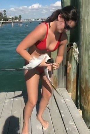 据报道,新年期间拉塞尔在海滩度假发现了这只可怜的海鸥。但她没有置之不理,而是决定行动起来拯救这只海鸥。她跳到码头尽头的一根木柱上,抱着这只可怜的海鸥,试图解开它脖子上的一段塑料,这时一个朋友拿着毛巾站在她身边提供帮助。拉塞尔接着从柱子上跳下来,她费力地把塑料袋从海鸥头上取下来,而海鸥一直惊恐地拍打着翅膀。