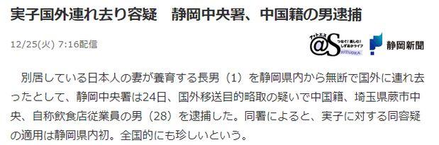 24日,一位在日本居住的中国男子把他1岁大的儿子带回中国后,被日本警察逮捕了,理由是警方怀疑“以移送外国为目标的掠夺” 。随后,警方表示,因带走亲生孩子而被以此种嫌疑逮捕的案例,在全日本都十分罕见。