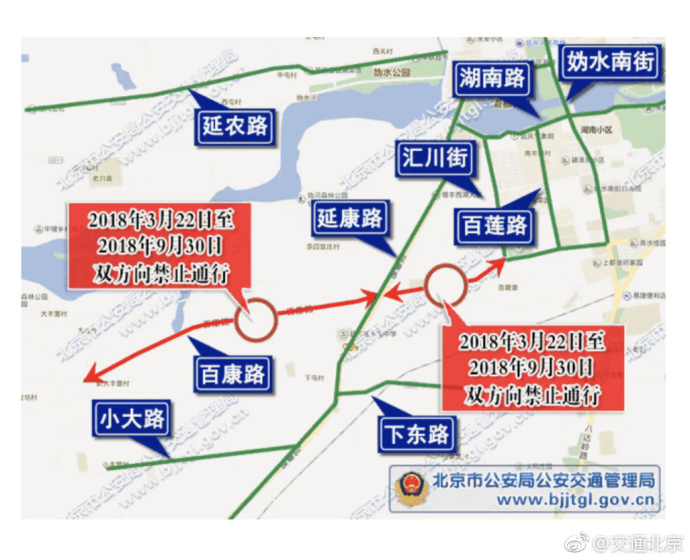 人民网北京3月13日电 据北京市交通委员会官方微博“交通北京”消息,因延庆区百康路(小丰营村北口——延康路、延康路——汇川街)进行占道施工,2018年3月22日至2018年9月30日期间,百康路(小丰营村北口——延康路、延康路——汇川街)双方向禁止通行,过往车辆及行人可绕行延康路、延农路、康张路、湖南路、汇川街、百莲路、下东路、妫水南街、百康路(汇川街——妫水南街)及小大路。