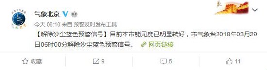 人民网北京3月29日电 据北京市气象台官方微博 @气象北京 发布,目前北京能见度已明显转好,市气象台2018年03月29日06时00分解除沙尘蓝色预警信号。