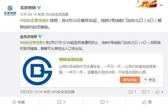 4月24日起北京地铁2号线前门站A口解除临时封闭措施