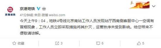 人民网北京5月25日电 据京港地铁公司官方微博发布,今天上午9:04,地铁4号线北京南站工作人员发现站厅西南侧客服,一空调有冒烟现象,工作人员立即采取措施将其扑灭,运营秩序未受到影响,给市民带来不便敬请谅解。