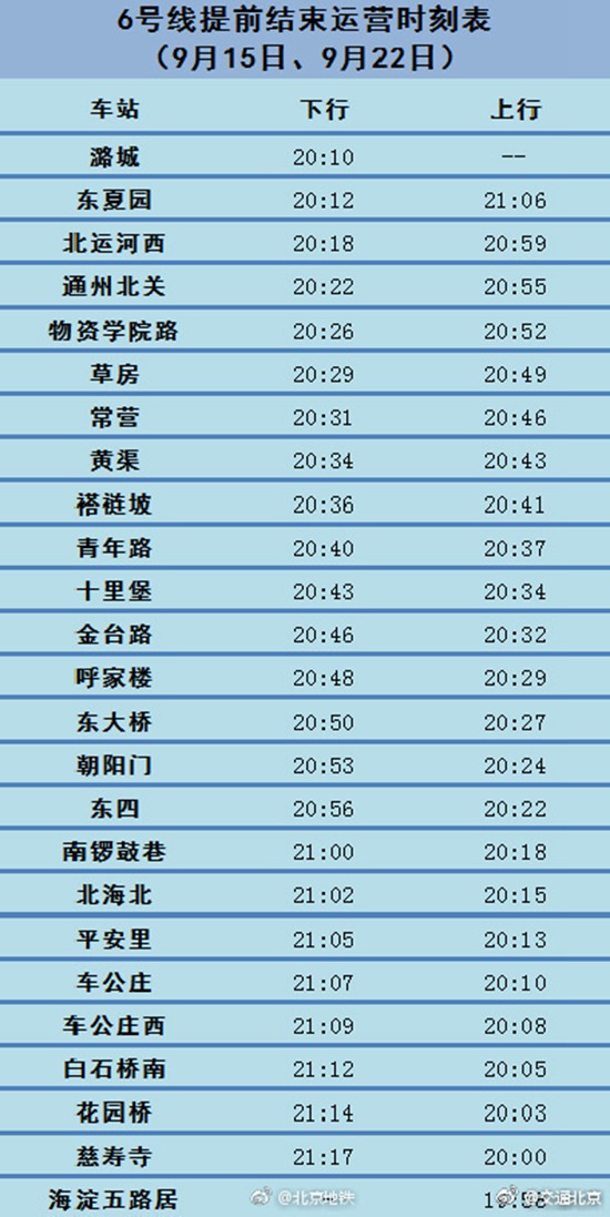 人民网北京9月20日电 据北京市交通委官方微博发布,9月22日(周六),6号线将提前结束运营。6号线各站自19:58起陆续停止售票和进站,沿途各换乘车站陆续停止换乘。请您提前规划好出行路线,6号线各站提前结束运营时刻表详见下图: