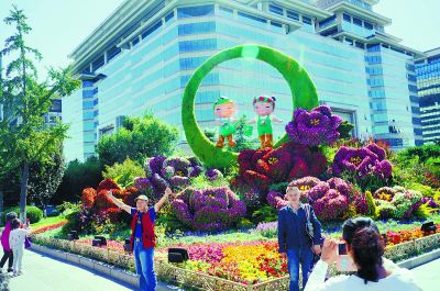 国庆节临近,长安街沿线的10座国庆主题花坛陆续竣工亮相,在西单路口东南角,以2019年北京世园会为主景的“绿色生活”主题花坛吸引了许多游人拍照留影。首都街头一派浓浓的喜庆氛围。本报特约摄影 樊甲山