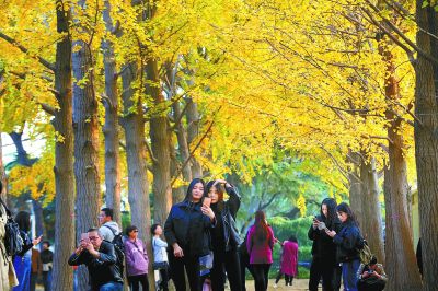 昨天,在钓鱼台银杏大道,人们踏秋赏景,拍照留念。伴随浓浓秋意,京城银杏树进入最佳观赏期。本报记者 方非摄