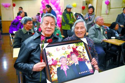 一对老人怀抱金婚纪念照合影留念。本报记者 和冠欣摄