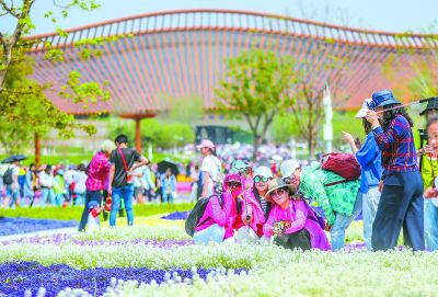 昨天,北京世园会园区内百花绽放,景色绚丽,芳香扑鼻。大批中外游客来到园区内赏景留影,感受园艺之美,享受美好自然。本报记者 武亦彬摄