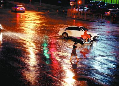 昨晚,在海淀区远大路上,行人在雨中匆匆赶路。本报记者 吴镝摄