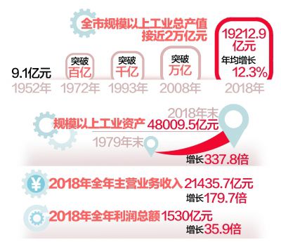 从生产总量看,新中国成立初期(1952年),全市规模以上工业总产值仅为9.1亿元;1972年、1993年、2008年分别突破百亿元、千亿元、万亿元;2018年达到19212.9亿元,年均增长12.3%。从资产规模和主营业务收入看,2018年末,规模以上工业资产48009.5亿元,较1979年末增长337.8倍;全年实现主营业务收入21435.7亿元,增长179.7倍;实现利润总额1530亿元,增长35.9倍。
