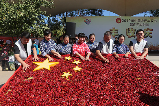 郭庄子农时荟上,村民用百余斤红辣椒拼成五星红旗。张雪峰摄