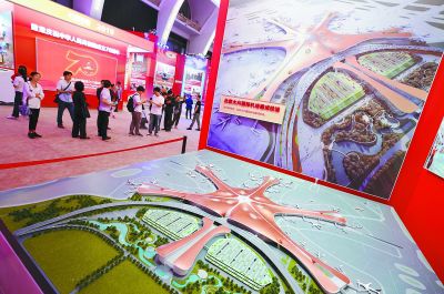 在展览现场,巨大的实物模型展示了北京大兴国际机场的风采——它从高空俯瞰宛如“凤凰展翅”,建筑外形由流畅的曲线构成,内部是一个巨大的开放空间,四层楼相互交织,屋顶,有一个巨大六边形天窗与六条条形天窗、八个气泡窗相互连接,将机场内部变成一个大型光庭。