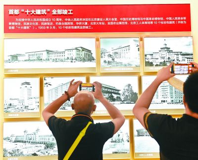 “十大建筑”照片吸引许多参观者驻足。本报记者 阎彤 摄