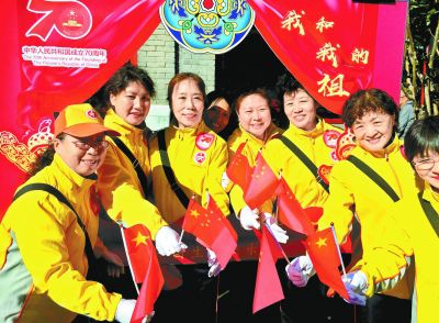 昨天,动人的歌声在陶然亭公园里响起,游客自发参与,舞动着手中的,,佩戴国庆主题贴纸,齐声唱响《我爱你中国》,用脍炙人口的旋律向伟大的祖国表白,用动情的歌声礼赞我们可爱的祖国,共同感受热烈欢乐的节日氛围,点燃大家对祖国母亲无限的深情。本报记者 吴镝摄