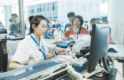北京市启动医耗联动综合改革,取消医用耗材加成。图为北京天坛医院门诊收费处工作人员在工作。