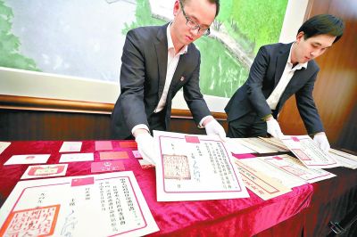 昨天,在香山革命纪念馆,工作人员将爱国名将陈铭枢后代捐赠的文物入藏。本报记者 饶强摄