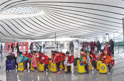 昨日,大兴国际机场,一批游学的小朋友准备登机。