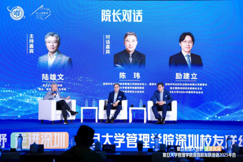 院长对话环节,陆雄文院长与深圳市东方富海投资管理公司创始合伙人、董事长、复旦大学管理学院兼职教授、深圳创业投资同业公会会长陈玮,深圳市科达利实业股份有限公司董事长、复旦大学管理学院深圳校友联络处主任、复旦大学EMBA华南同学会会长励建立,围绕技术出海、中国资本市场未来趋势等话题展开精彩讨论。