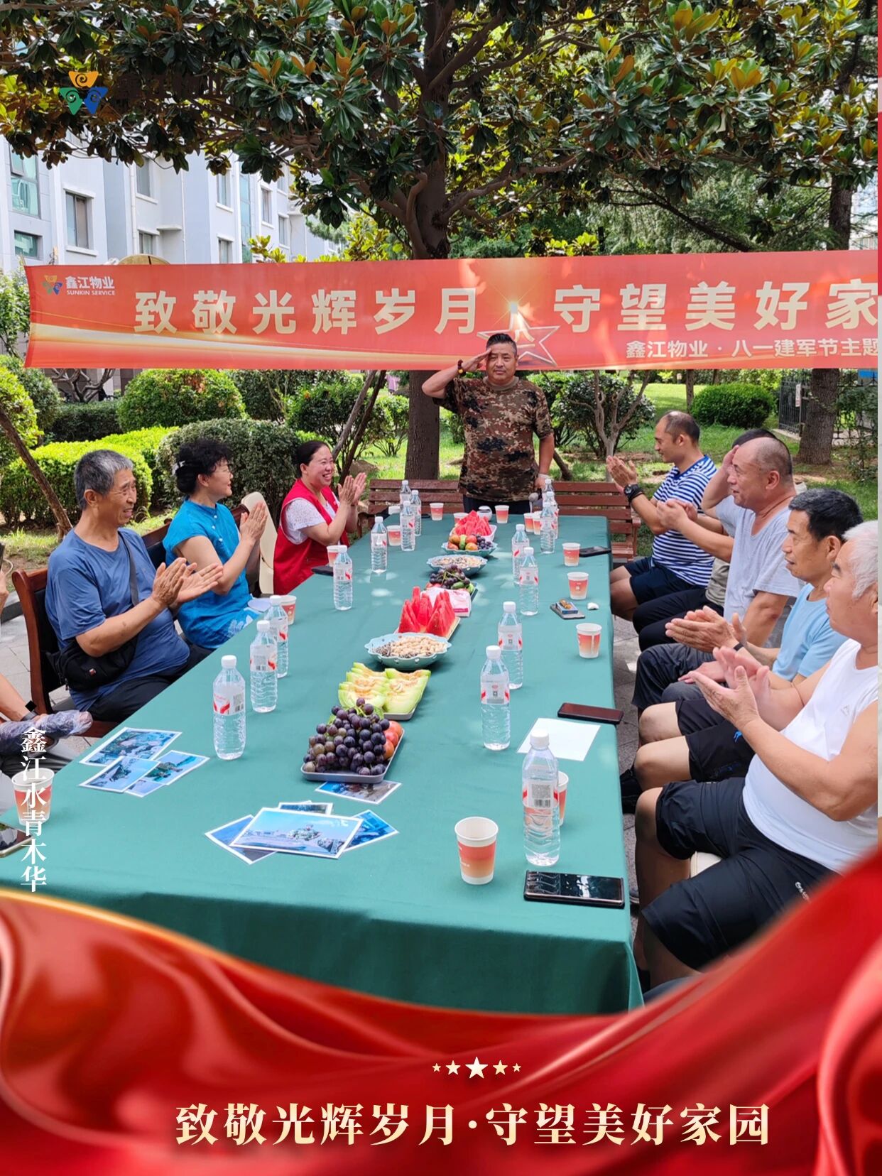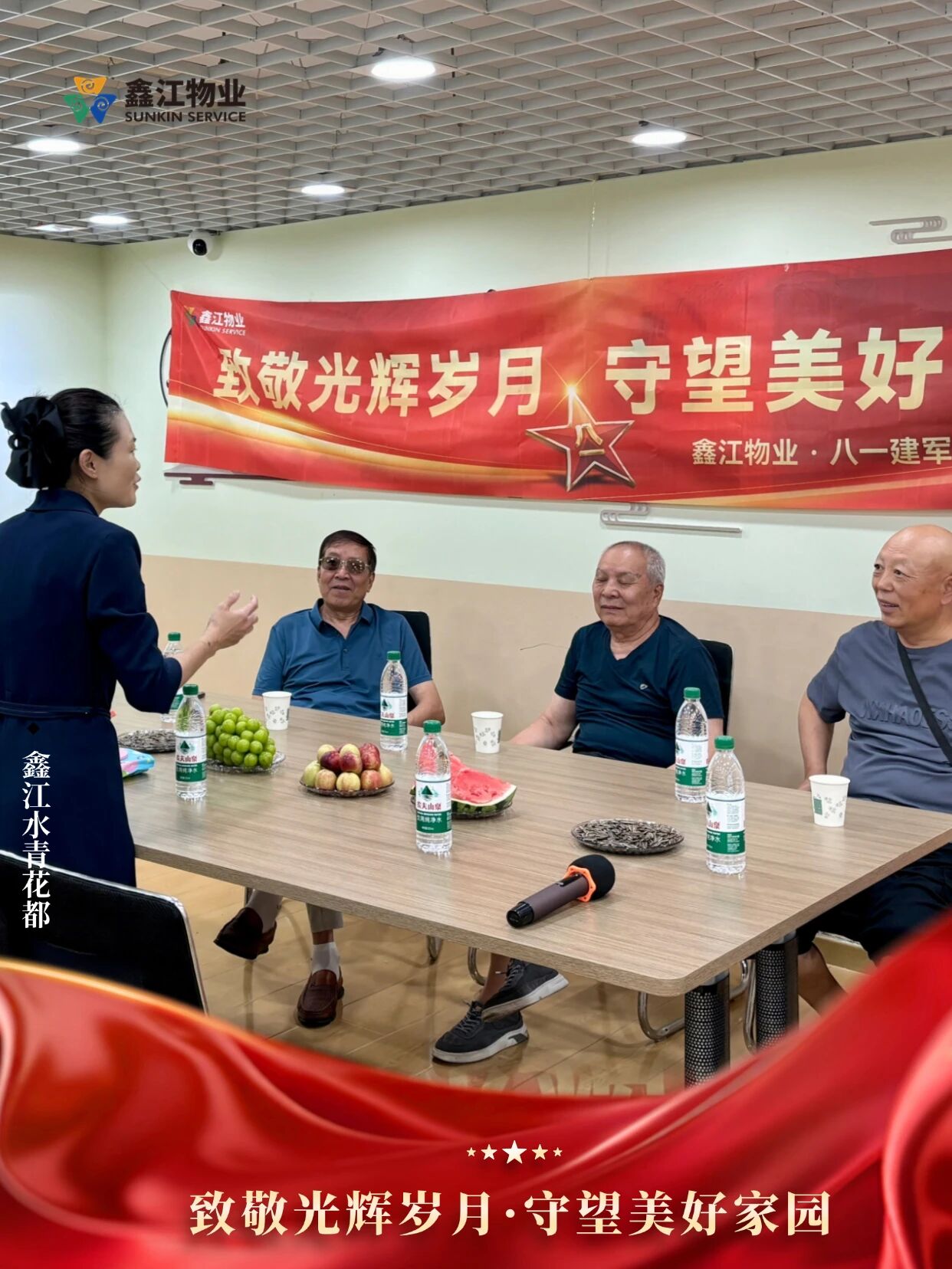 8月1日,鑫江物业各项目精心筹备的“致敬光辉岁月 守望美好家园”八一建军节主题座谈会圆满举行。我们怀着最崇高的敬意,邀请小区内的老红军、退伍军人、现役军人及军属们团聚一堂,唱军歌、忆往昔、话家常,共叙军人邻里情。