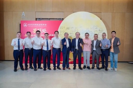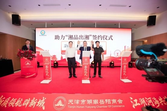 助力 “湘品出湘” 签约: 湖南省名优特产商贸协会会长刘智益、天津湘菜协会拟任执行会长赵静、天津市湖南岳阳商会会长魏红军共同登台签约,三方将整合优质湘品资源、打通产销链路,助力湖南特色产业升级;