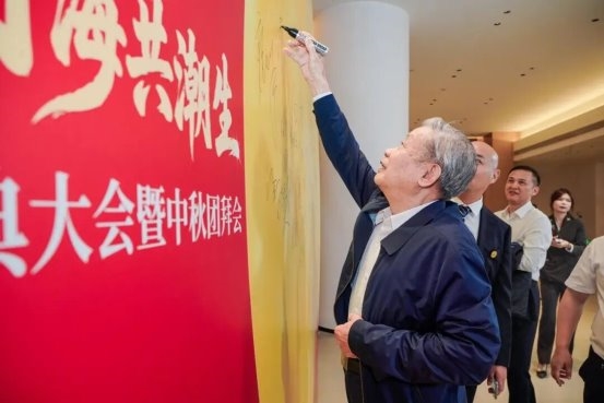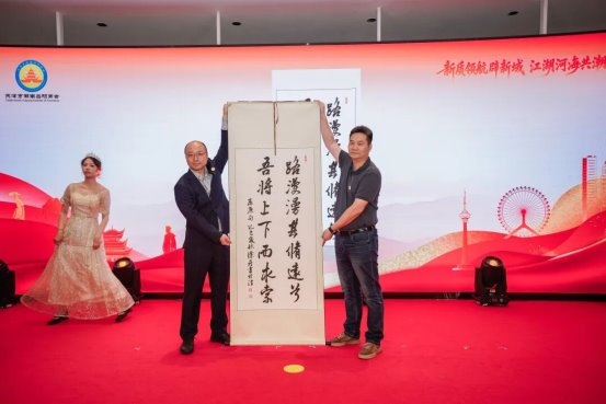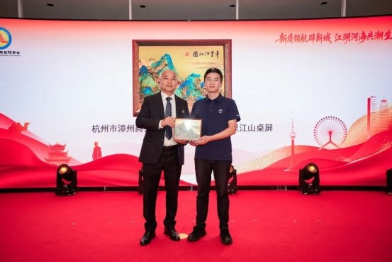 庆典现场还涌动着跨地域的情谊:天津海河传媒中心记者、汨罗市政府智库专家徐丹委托天津市汨罗商会秘书长童军送来书法作品 “路漫漫其修远兮,吾将上下而求索”,以屈原精神寄语商会奋进;杭州市漳州商会常务副会长林伟栋代表商会,送上国家非遗铜雕技艺传承人朱炳仁作品《千里江山图·铜版画》,祝愿商会蓬勃发展。
