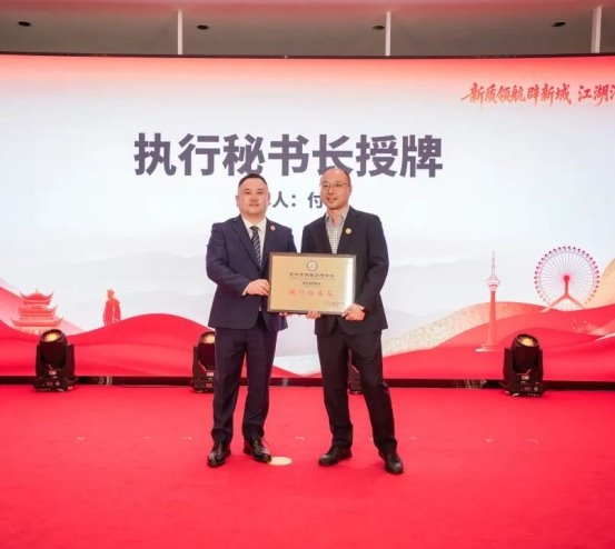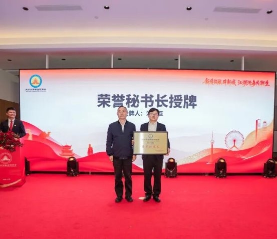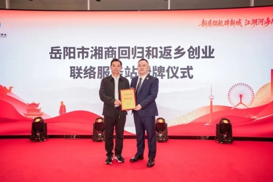 庆典进入庄严而隆重的授牌仪式。岳阳市委统战部副部长、市工商联党组书记方卫兵为 “岳阳市湘商回归和返乡创业联络服务站” 授牌,魏红军会长接牌,标志着商会正式成为家乡招商引资、湘商回流的 “前沿纽带”;紧接着,从会长单位、荣誉会长单位到监事单位,各会员单位代表依次登台受牌,一块块牌匾既承载着荣誉,也肩负着未来携手奋进的责任。