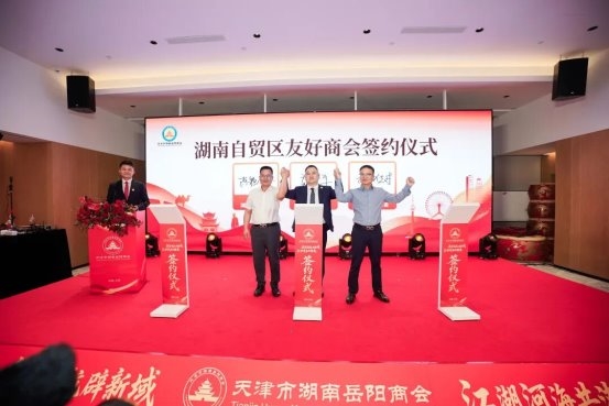 助力“湘商回归”的湖南自贸区友好协会签约: 天津市湖南长沙商会秘书长陈稳林、天津市湖南郴州商会常务副会长刘四澍、天津市湖南岳阳商会会长魏红军携手落笔,借助长沙、岳阳、郴州三大自贸片区各自的产业优势,实现资源互补、政策共享,为在外湘商返乡投资搭建 “精准归航” 平台;