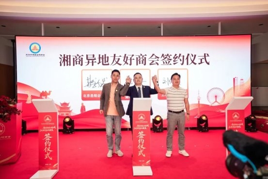 现场还开展了助力“湘品出湘”签约仪式、湖南自贸区友好协会签约仪式、湖南异地友好商会签约仪式,三场签约仪式推动庆典进入高潮,标志着商会 “架津湘之桥、促会员共荣” 的决心落地为跨域协作的具体行动: