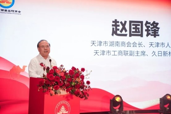 天津市人大常委、天津市工商联副主席、天津市湖南商会会长赵国锋 首先向大会顺利召开、魏红军当选会长致以热烈祝贺,同时感谢岳阳商会往届领导班子为省商会发展作出的贡献。他肯定魏红军会长带队开展的活动特色鲜明、成效显著,印证了换届人选的正确选择;提及今年多个分会新当选会长年轻有为、充满活力,为商会注入新动能。此外,他分享喜讯 —— 天津市湖南商会在华北五省市湘商交流大会上获评 “湖南省一类商会标杆商会”。赵国锋呼吁在场乡贤与同仁持续发力,共同维护湖南商会大家庭,擦亮天津湖南商会品牌、提升影响力;并希望岳阳商会会员在魏红军会长带领下积极贡献力量,为家乡发展与乡村振兴添砖加瓦。