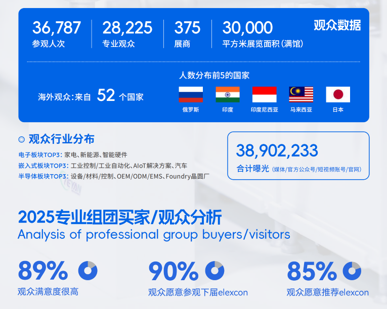 上届展会观众满意度高达89%,展商满意度达85%,充分印证了elexcon在行业中的影响力与平台价值。