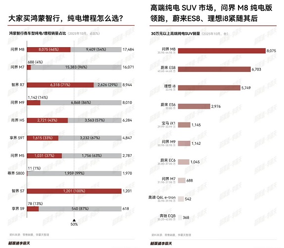 问界 M8 的成功,核心在于对家庭用户需求的精准把握。其纯电 + 增程的双动力组合,全面覆盖城市日常通勤、周末短途出游、跨省长途自驾等多元出行场景。从交付数据来看,12 万辆的交付总量中,增程版占比 54%,纯电版占比 46%,两种动力版本的均衡销量,印证了其产品布局的精准性与合理性。
