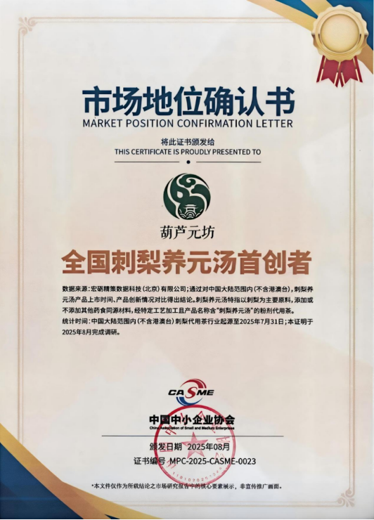 在中国大健康赛道上,刺梨并非无人问津。但真正推动标准建立、技术体系成型的企业并不多。2021年,葫芦元坊牵头制定《药食同源刺梨养元汤技术》等,团体标准,这意味着刺梨产品不再只是区域特产,而走向了严谨、科学、可检测、可复制的行业高度。