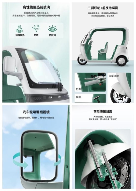 同时,900mm后轮距带来的38°侧倾临界角将弯道行驶时的车身倾斜度降低41%,260mm踏板高度结合1600mm车高低,设计,进一步提高了高速行驶稳定性。再配合高亮三透镜大灯+一体式贯穿尾灯,制动更灵敏的三刹联动制动系统,视野更开阔的700mmX600mm大尺寸前挡风,以及采用多角度调节设计的汽车级高清防眩可调节后视镜,营造出全方位驾乘安全体系,为视觉与反应能力衰退的老年人想得更多。