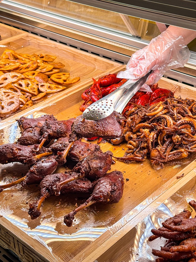 在产品策略上,周黑鸭海外首店在保留卤鸭脖、卤鸭锁骨等经典核心SKU的基础上,针对马来西亚市场进行了本土化创新。门店主推“整腿多汁、个大肉厚”的卤鸭腿及“鲜嫩肥美、劲道弹牙”的章鱼仔等明星单品,并新增海带结等素菜系列,同时引入小龙虾、鱿鱼须、扇贝等小海鲜品类。这一组合既坚守了周黑鸭“经典风味”的品牌内核,又通过丰富的选择贴合了当地消费者的多元口味需求,展现出灵活的产品策略。