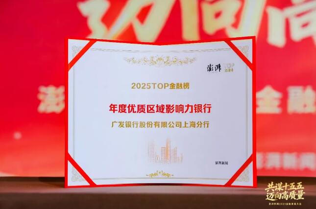 近日,广发银行上海分行凭借专业优质金融服务,荣获澎湃新闻2025TOP金融榜“年度优质区域影响力银行”奖项。