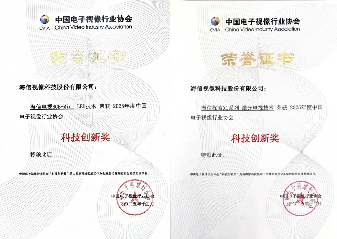 12月19日,中国电子视像行业协会在北京隆重举办了第二十一届中国音视频产业大会。会上对音视频产业取得的重大创新科技成果进行表彰,颁布了音视频领域,权威的“科技创新奖”。海信RGB-Mini LED电视凭借全球首创的“RGB三维控色液晶显示技术”、海信激光电视探索X1系列凭借重塑家庭影院观影体验等方面的,创新,一并斩获2025年中国电子视像行业协会“科技创新奖”。