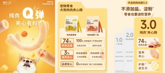 诚实一口肉肉夹心肠扎实有料,不添加纯淀粉。选用优质白羽鸡作为主要原料,100%动物蛋白,肉类含量高达74%,让狗狗吃的每一口都是真实肉香、纯粹满足。该产品更在配方上精细打磨,添加了3%营养夹心,并推出两种口味:鸡肉蛋黄味和鸡肉胡萝卜味。每一根肉肠都以鸡肉为基础,特别添加养胃山药、FOS果寡糖,助力消化吸收,呵护肠道健康,让美味无负担。