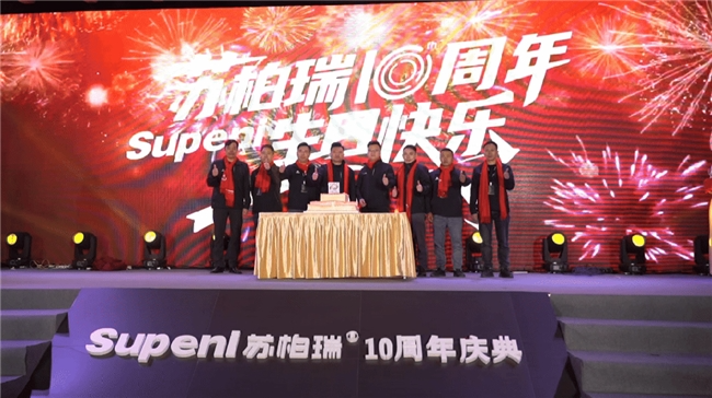 智造十载・再启新程。Supeni 苏柏瑞 总经理陈荣淼携高层领导举杯祝酒,一同向现场所有嘉宾、合作伙伴及全体同仁致以诚挚谢意,共贺苏柏瑞十周年生日快乐,共赴下一段璀璨新程!