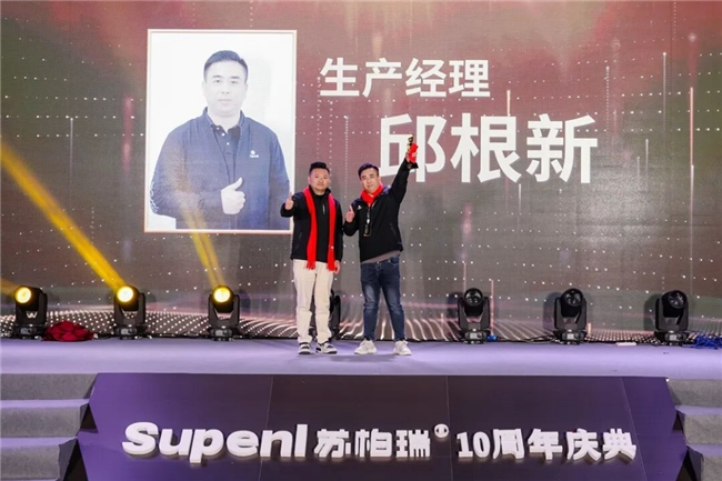 Supeni苏柏瑞 总经理陈荣淼为员工颁十年功勋奖和,奖,感谢他们十年如一日的坚守;掌声与欢呼声交织,致敬每一份付出,铭记每一份信任。
