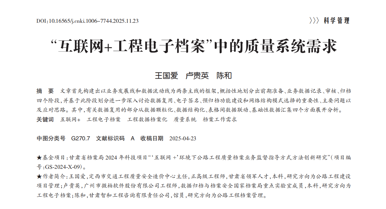 基于项目研究,课题组成员撰写的论文《互联网+工程电子档案中的质量系统需求》已于2025年11月在《兰台世界》杂志发表。