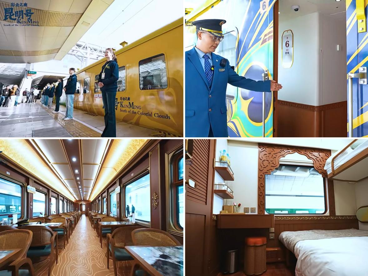 “彩云之南·昆明号”跨国旅游列车是由昆明市文化和旅游局、昆明市文旅集团联合中国铁路昆明局集团共同打造的全国首趟舒适型跨国旅游专列,列车提供中老铁路线及云南环线两大高品质旅行选择,设有安途尊享、悦途品质等多种房型,配备独立卫浴、多功能车厢、非遗文化展演等设施与服务,致力于为旅客提供“一价全包、慢旅深体验”的高端跨境旅游新选择。