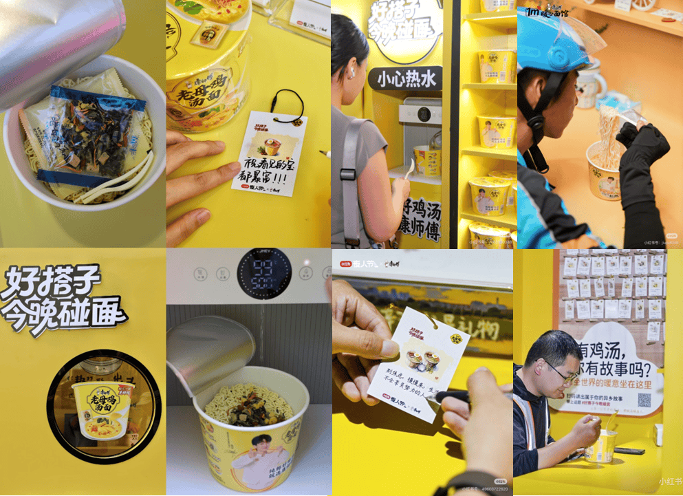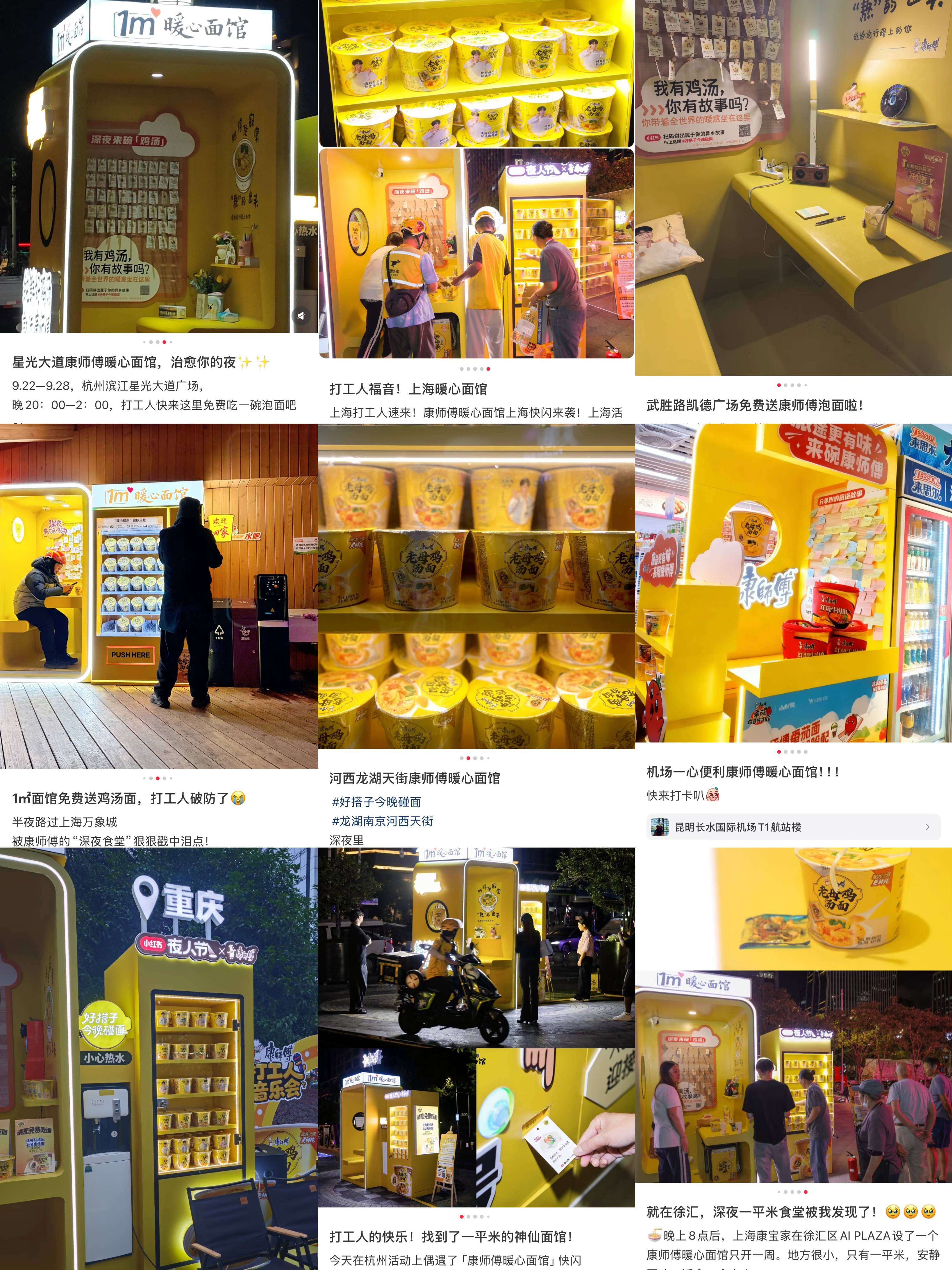 快消渠道的本质是连接人与货的节点,而康师傅的创新在于,将这个节点从冰冷的“交易点”升温为有情绪的“共鸣点”。“1㎡暖心面馆”便是这一理念最生动的注脚。2025年9月起,形似电话亭的快闪面馆陆续落地上海、杭州、深圳、安徽、四川、重庆、南京、甘宁、湖北等城市,以“1㎡私密空间+免费暖心泡面”为核心体验,每晚八点到凌晨两点,为奔波的骑手、晚归的白领等城市夜归人送上热腾腾的老母鸡汤面。这里不仅提供食物,更搭配治愈音乐和心事交换墙,迅速在社交媒体上发酵为一座座“情感,”,“深夜治愈”与“城市温暖”成为深入人心的标签。