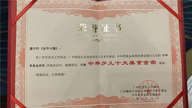 “美食是文化的味觉载体,音乐是情感的听觉表达。”广州市音乐文学协会主席在致辞中表示,“中华美食金曲奖”的创立初衷,正是希望以音乐为桥梁,让更多人通过歌声了解中国饮食文化的深厚底蕴。本次评选共收到来自全国23个省市的127首作品,经初评、复评及现场展演三轮筛选,最终选出十大少儿金曲与十大成人金曲。潘宇轩的《金华火腿》作为,一首以非遗美食为主题的少儿作品获奖,也印证了“小切口、大文化”创作思路的成功。