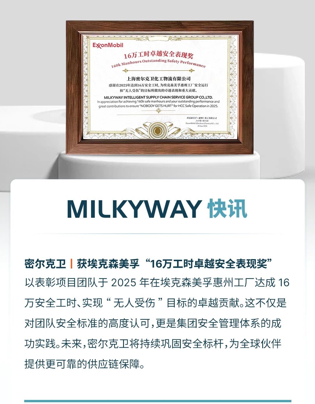 获埃克森美孚“16万工时卓越安全表现奖”