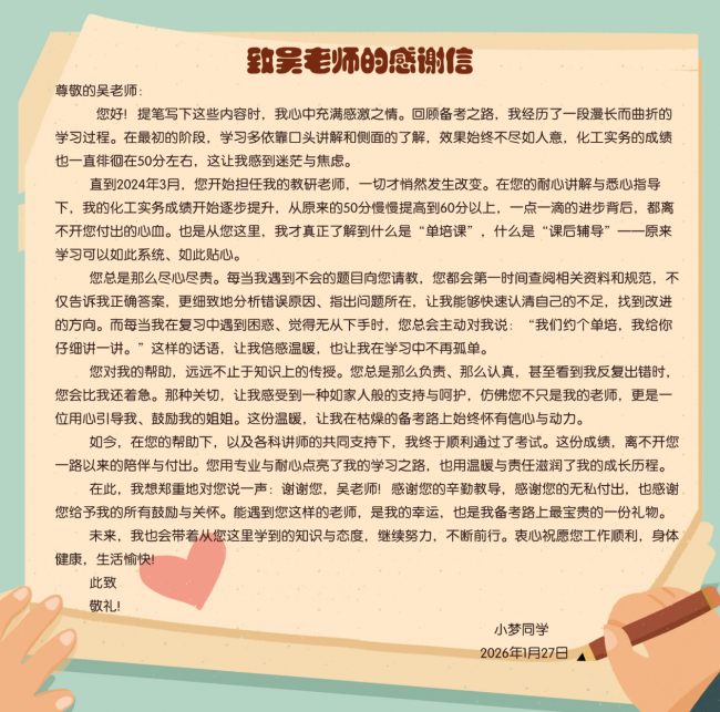 针对这一情况,吴老师继续以“掌握常考,、强化题目训练”为核心,坚持针对性单培辅导。随着相处的时间越来越长,对吴老师越来越信任。小梦同学会主动和吴老师分享一些工作和生活中的趣事和烦恼,而吴老师会耐心倾听,在专业辅导的同时也给予及时的鼓励。