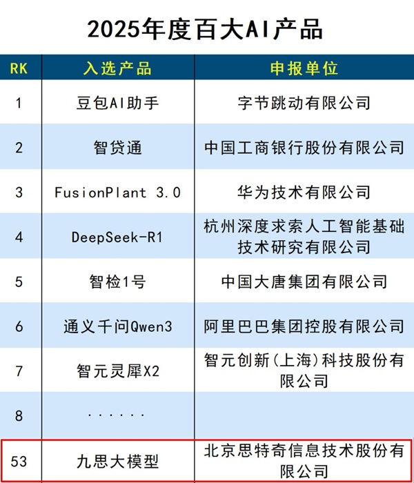 近日,国内知名咨询机构DBC德本咨询正式发布《2025人工智能领军企业100强》、《2025年度百大AI产品》两大榜单。凭借在人工智能领域深厚的技术沉淀、持续的产品创新与规模化的落地能力,思特奇成功入选《2025人工智能领军企业100强》,自主研发的易问·九思大模型同步入选《2025年度百大AI产品》。此次双榜入选,充分体现了思特奇在AI原生服务体系建设与核心技术产品化方面的综合实力,亦彰显了公司在推动产业智能化转型过程中所发挥的重要作用与行业影响力。