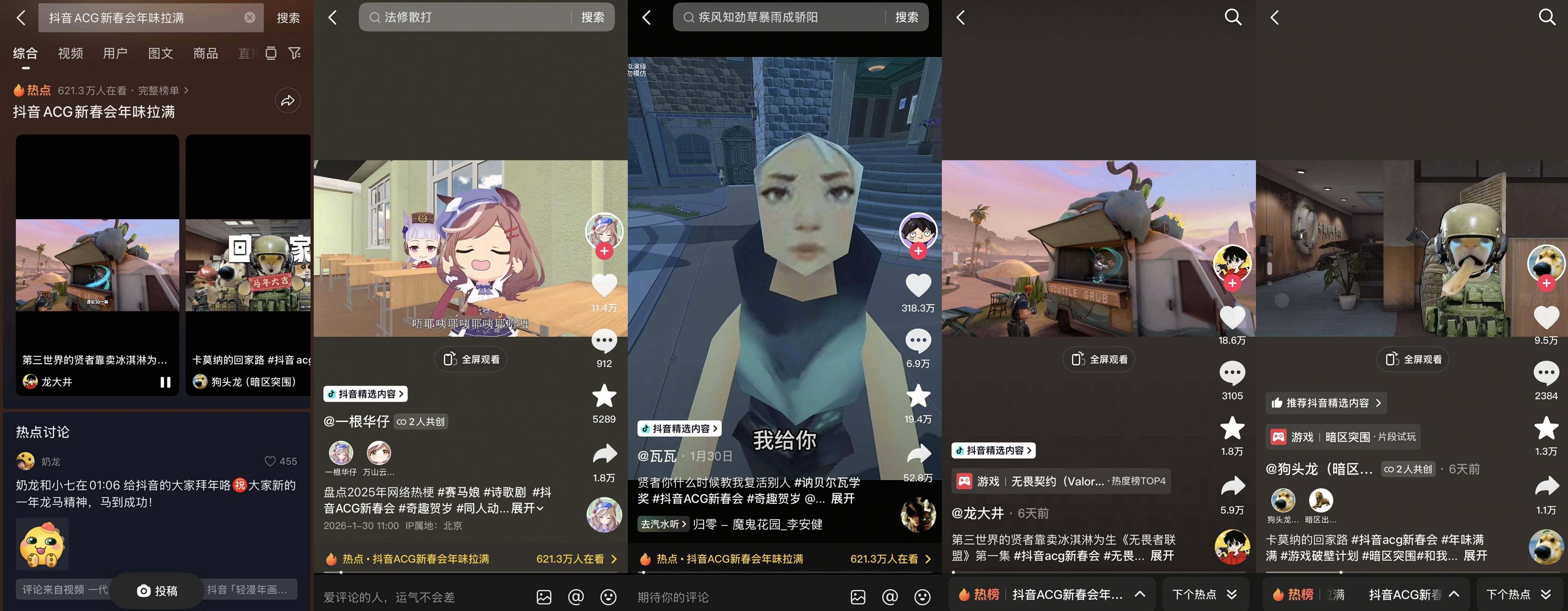 亮眼数据之外,网友的热议为首届抖音ACG新春会写下了更具温度的评价。这场持续一个月的内容盛宴,以五大主题篇章为基底,如同五道风味各异的佳肴,在轮番登场中精准击中不同圈层的审美偏好,也掀起了一场持续发酵的创作热潮。