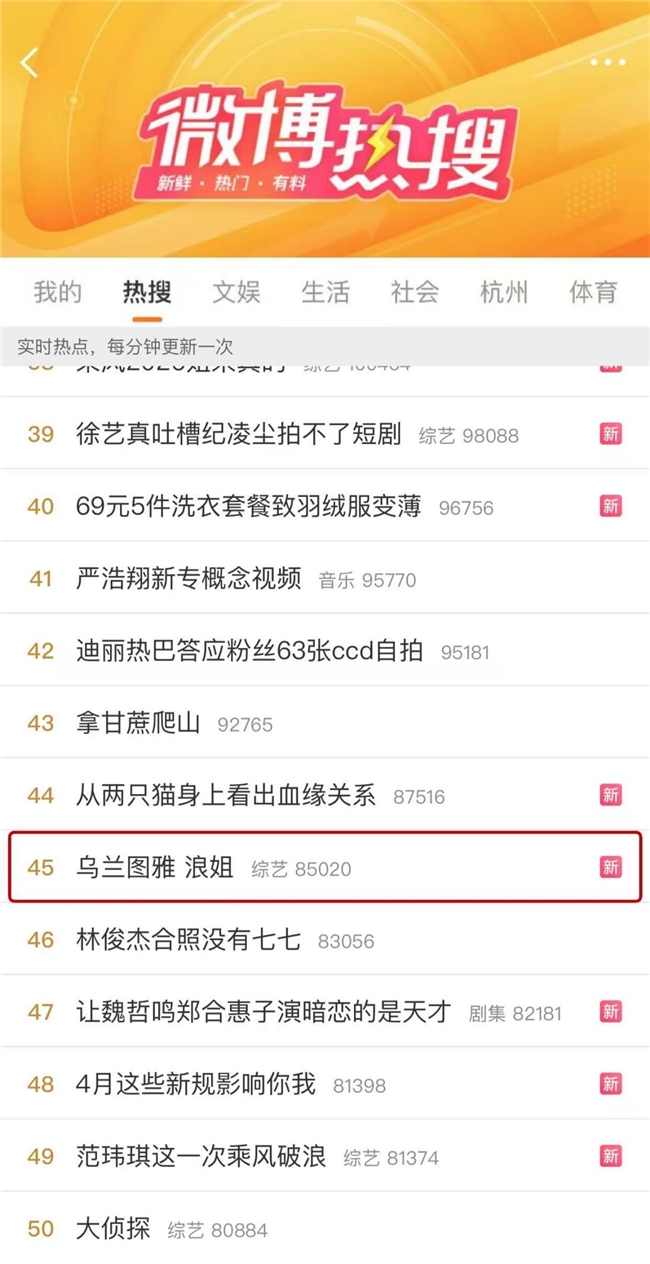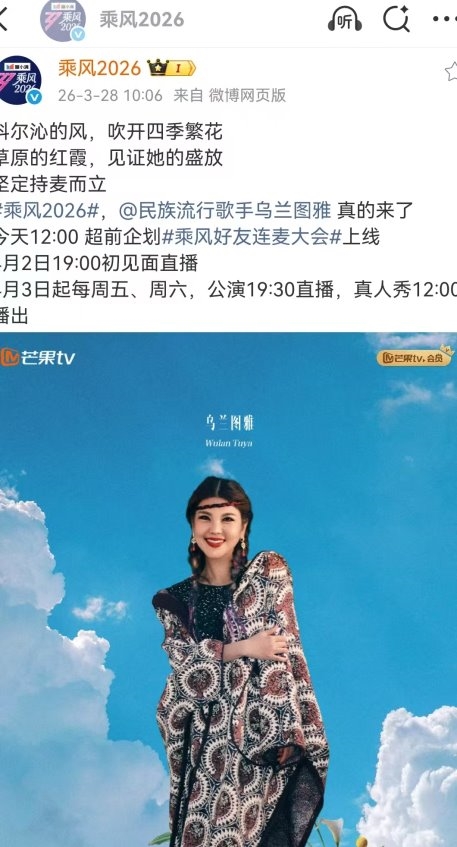 在这份星光熠熠的名单中,民族流行歌手乌兰图雅的加盟引发热烈讨论,不仅以 “# 乌兰图雅 浪姐 #” 话题登上微博热搜,更与同场歌手者来女的联动话题 “# 者来女 乌兰图雅 #” 同步跻身文娱热搜榜,#乌兰图雅从草原唱到乘风 话题也登上抖音热点,足见观众对她的期待。