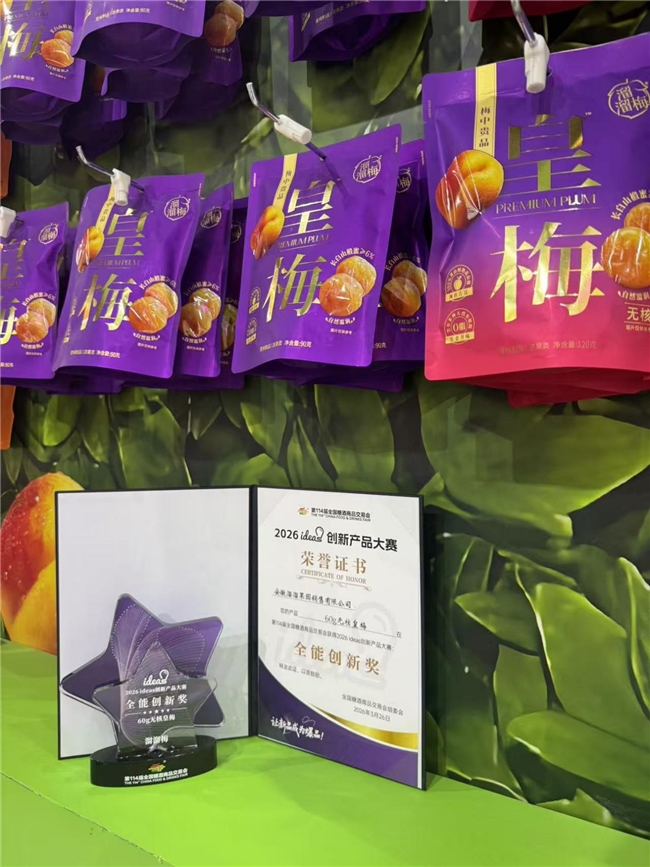 日前,第114届全国糖酒商品交易会盛大召开。作为全球食品饮料行业的风向标,本届春糖汇聚了来自国内外数千家知名品牌与前沿力量,共同呈现一场关于产品、技术与消费趋势的饕餮盛宴。在这场群英荟萃的行业盛会上,溜溜梅携多款爆品惊艳亮相,凭借,的创新力与产品力成为展馆内瞩目的焦点。更令人瞩目的是,得益于在原料、工艺及健康理念上的全面突破,溜溜梅60g无核皇梅,一举斩获“2026ideas创新产品大赛全能创新奖”。这一奖项不仅是对品牌深耕青梅品类的高度认可,更标志着溜溜梅在高端化、健康化赛道上迈出了坚实一步。奖项背后,是一整套围绕“高品质、高标准、高价值”展开的产品逻辑,也为整个行业提供了可借鉴的差异化创新范本。