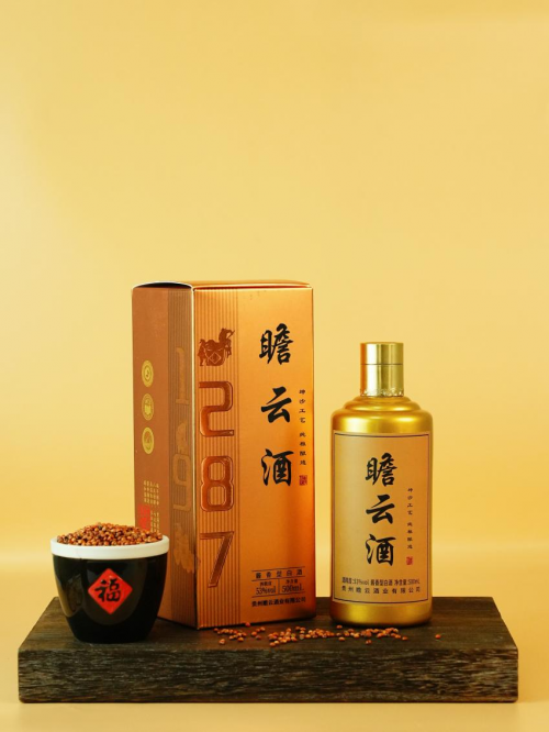 本次获赋码认证的瞻云酒(赋码款),是企业推出的核心旗舰产品,金色瓶身搭配质感礼盒,盒身 “12987” 标识体现产区传统工艺,产品标注坤沙纯粮酿造,53% vol、500ml 规格,由瞻云酒业生产出品。产品简约大气、定价亲民,是贴合市场需求的产区优质酱酒。