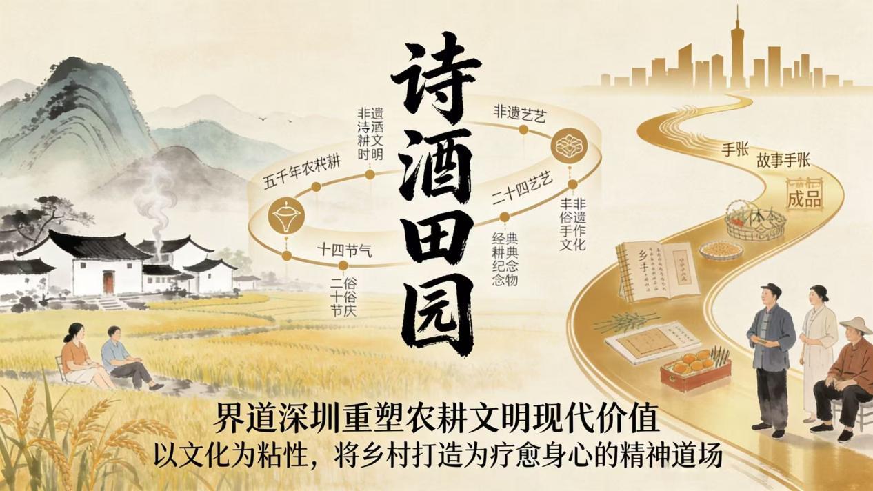 在乡村全面振兴的时代命题下,界道(深圳)乡村产业运营管理有限公司将文化作为“农商文康旅”五大矩阵的粘性之魂。通过挖掘五千年“诗酒田园”的精神寄托,以非遗工坊、乡村故事为载体,让乡村不仅是产业集聚地,更成为城市人群放空心情、回归悦己的精神道场。